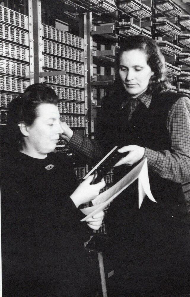 Valsts elektrotehniskās fabrikas (VEF) inženiere konstruktore Lidija Sandere (no kreisās) un telefonijas ceha meistare Beta Sautiņa pie jaunās automātiskās telefona centrāles.