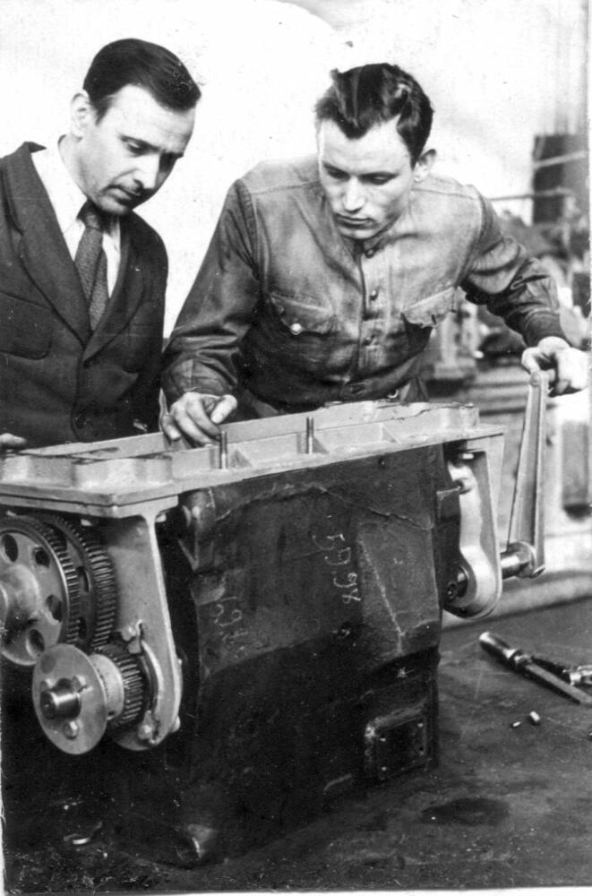 Rīgas eksperimentālās rūpnīcas "Stars" darbinieki pie gultņu izvirpošanas darbgalda.