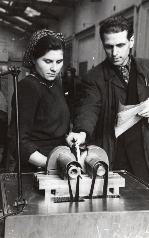 Valsts elektrotehniskās fabrikas (VEF) 22. ceha vecākais meistars E. Augstkalns un slīpētāja N. Jakovenka pie darba galda.