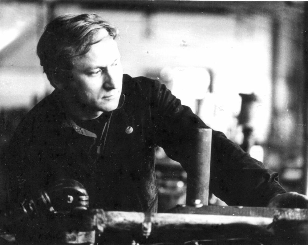 Rīgas eksperimentālās rūpnīcas "Stars" atslēdznieks, traktoru dzinēju speciālists Karls Konošenoks darba laikā.