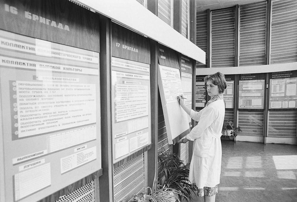 Rūpnīcas “VEF” kvazielektroniskās centrāles “Kvants” atslēdzniece, montētāja Biruta Kalpiņa pie sociālistisko sasniegumu stenda.