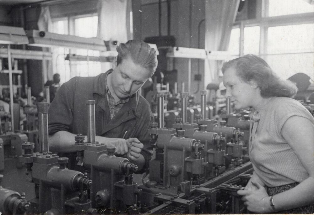 Valsts elektrotehniskās fabrikas (VEF) atslēdznieks Eduards Laskovskis un montiere Margarita Beļza. Darba process pie automātiskās līnijas, kas paredzēta releju atsperu izgatavošanai.