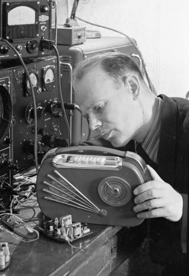 Rūpnīcas VEF inženieris A. Bračs darbā pie sava izveidotā pusvadītāju mazgabarīta radioaparāta modeļa ražošanas parauga.