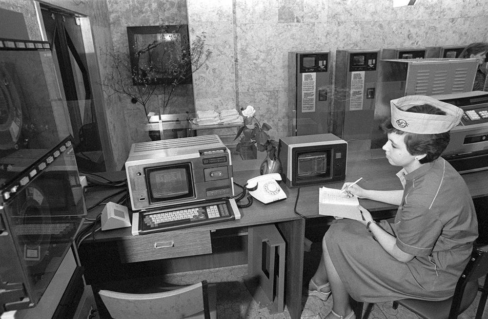 Sabiedriskās ēdināšanas kombināta “Vefietis” elektroniskās skaitļojamās mašīnas operatore Inna Segrutina pie kulinārijas veikala vadības pults.