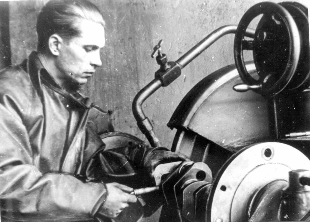 Rīgas eksperimentālās rūpnīcas "Stars" slīpētājs J. Karandžeis darba laikā.