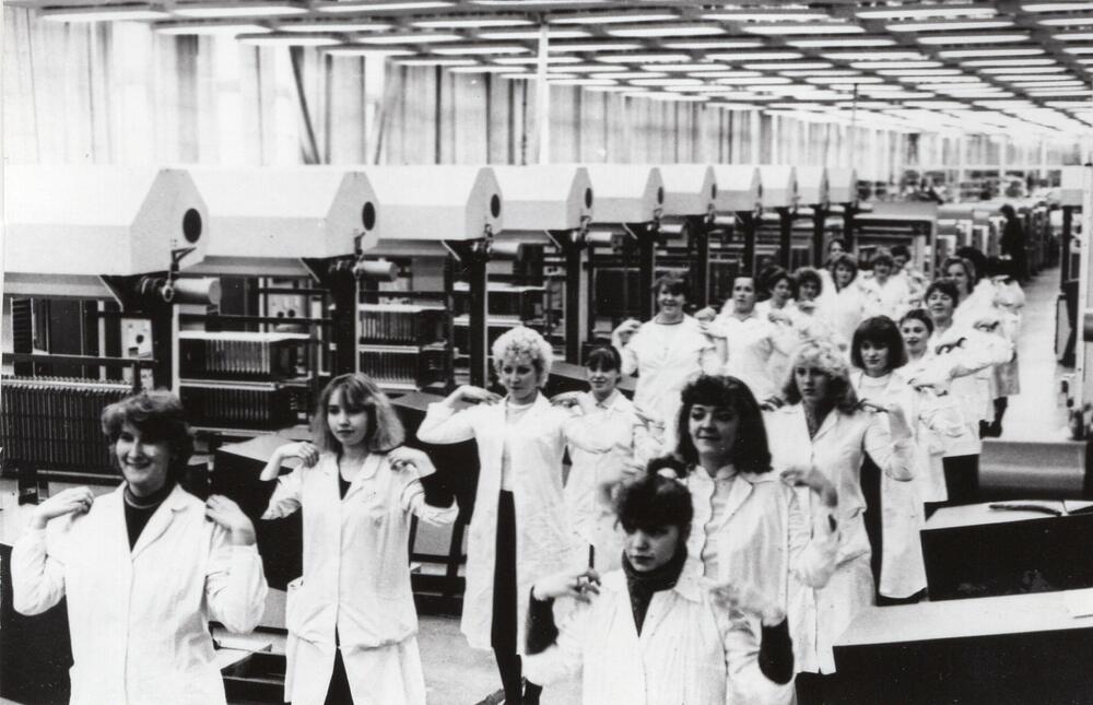 Viens no Valsts elektrotehniskās fabrikas (VEF) cehiem. Vingrošanas pauze darba vietā.