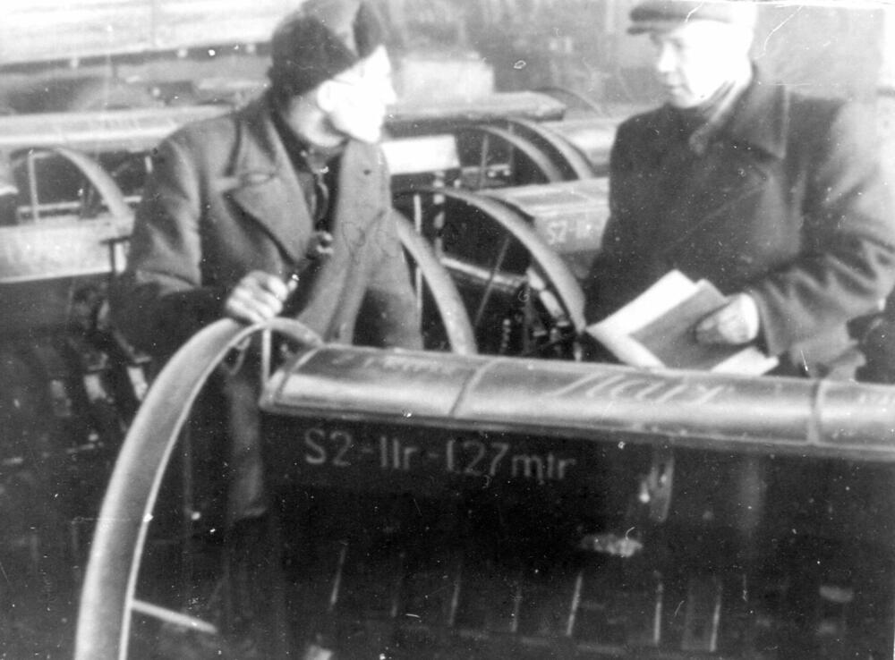 Rīgas eksperimentālā rūpnīca "Stars". Lauksaimniecības tehnikas nodaļas meistars J. Cīrulis (2-no kreisās) un nodaļas brigadieris V. Kundziņš pie sējmašīnas.