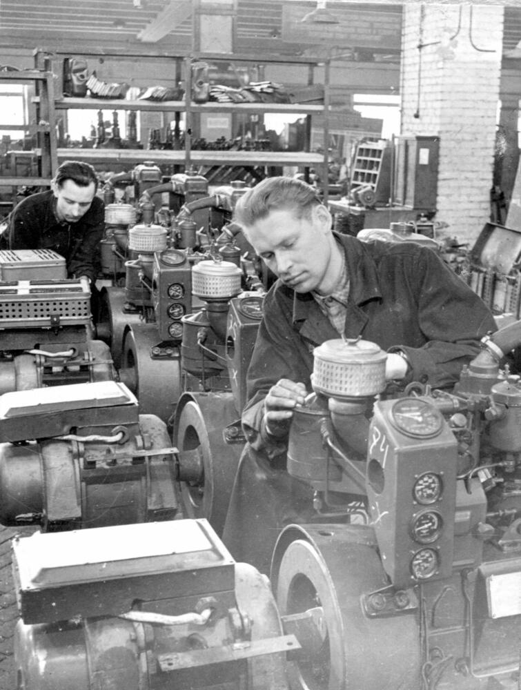 Rīgas eksperimentālās rūpnīcas "Stars" atslēdznieki I. Piņčuks (no labās) un I. Patarovičs veic pārvietojamu elektrostaciju montāžu.