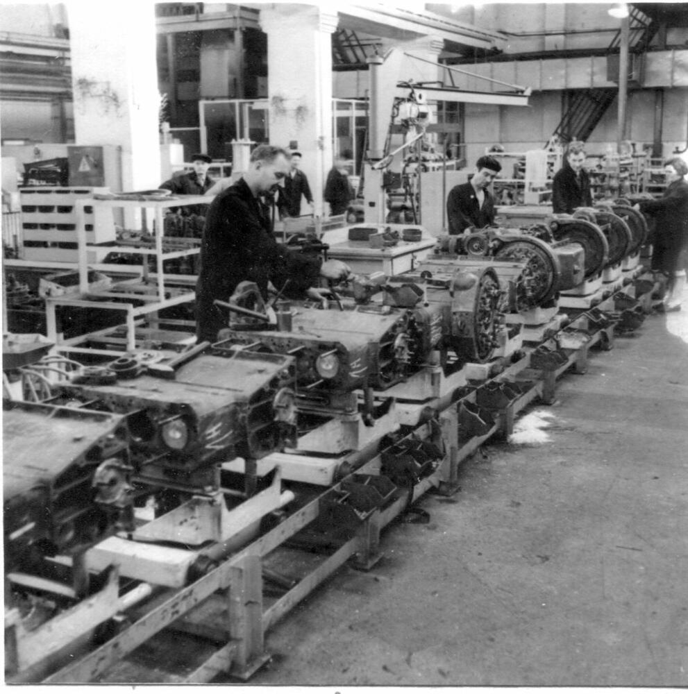 Darba process Rīgas eksperimentālās rūpnīcas "Stars" dzinēju montāžas cehā. Priekšplānā : montieratslēdznieks Alberts Rimšs.