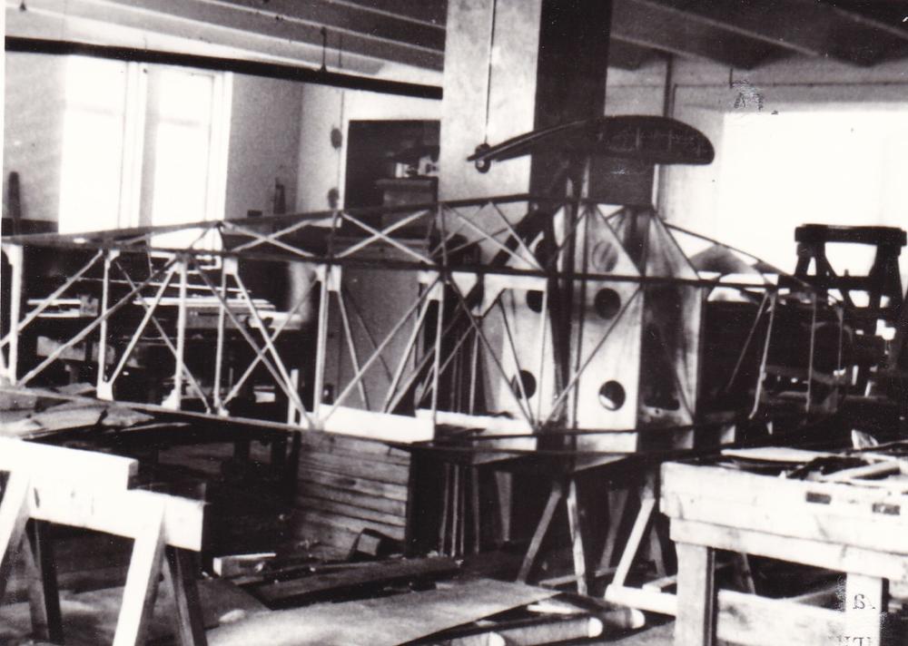 Latvijas sporta aviācijai ražotā planiera "VEF - 1" konstrukcija uz darba galda VEF cehā.