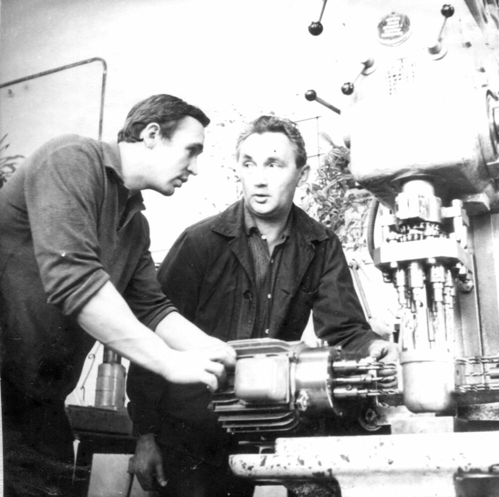 Rīgas eksperimentālās rūpnīcas "Stars" instrumentu atslēdznieki P. Siliņš (no kreisās) un A. Eņģelis pie urbšanas darba galda.