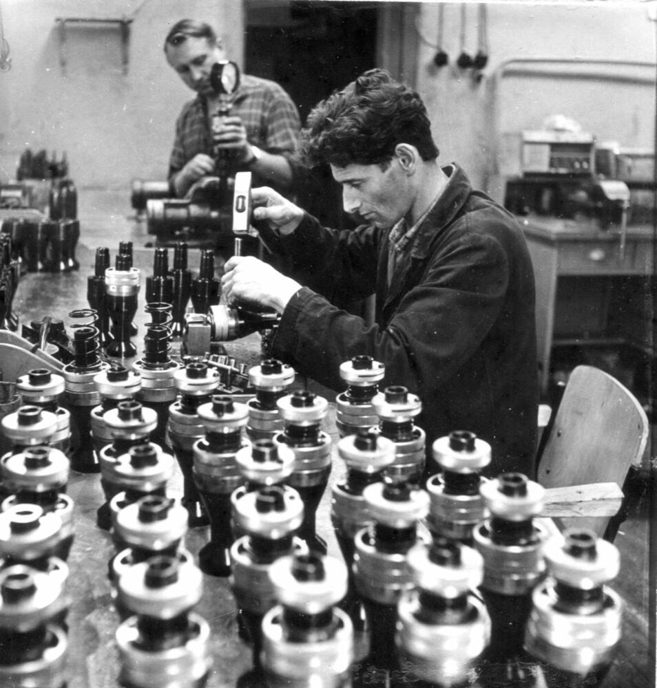 Rīgas eksperimentālā rūpnīca "Stars". Montiratslēdznieki S. Gorodeckis (no labās) un A. Arikovs veic ierīču "KH-4840" montāžu.