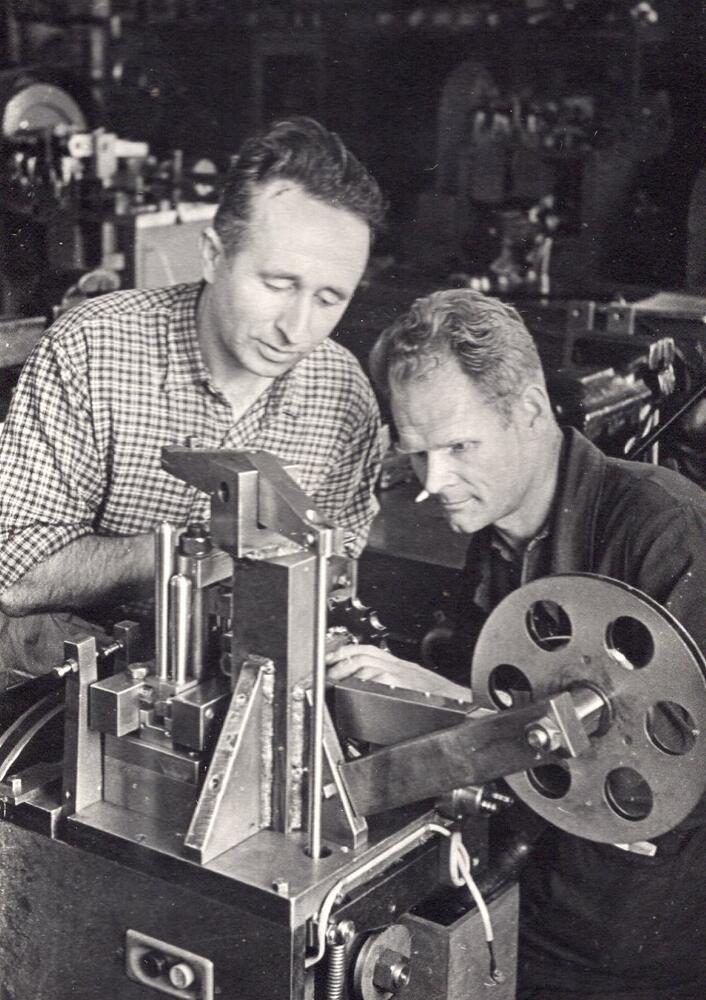 Valsts elektrotehniskā fabrika (VEF). Štancēšanas automātu izgatavošanas iecirkņa vadītājs, instrumentu atslēdznieks, ražošanas novators, Sociālistiskā Darba Varonis Voldemārs Bušs (no kreisās) un atslēdznieks J. Zaderņuks pie jaunā štancēšanas automāta.