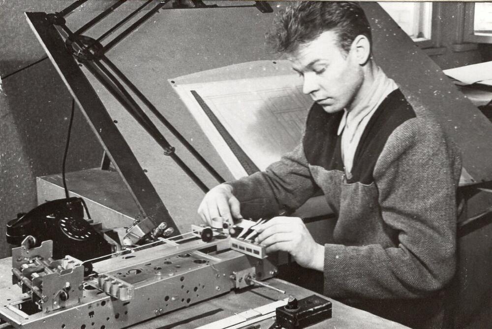 Valsts elektrotehniskās fabrikas (VEF) konstruktoru biroja inženieris Dzintars Reķis pie darba galda.