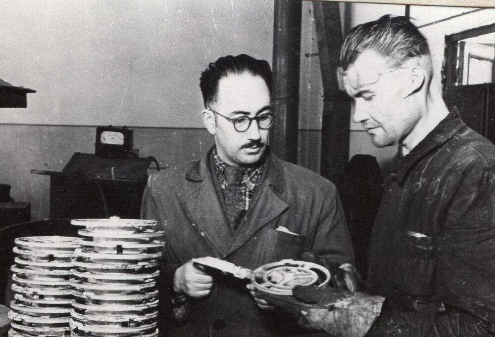 Valsts elektrotehniskā fabrika (VEF). Liešanas ceha vadītājs, inženieris M. Terikovs (no kreisās) un lējējs E. Strods veic gatavās produkcijas kvalitātes kontroli.