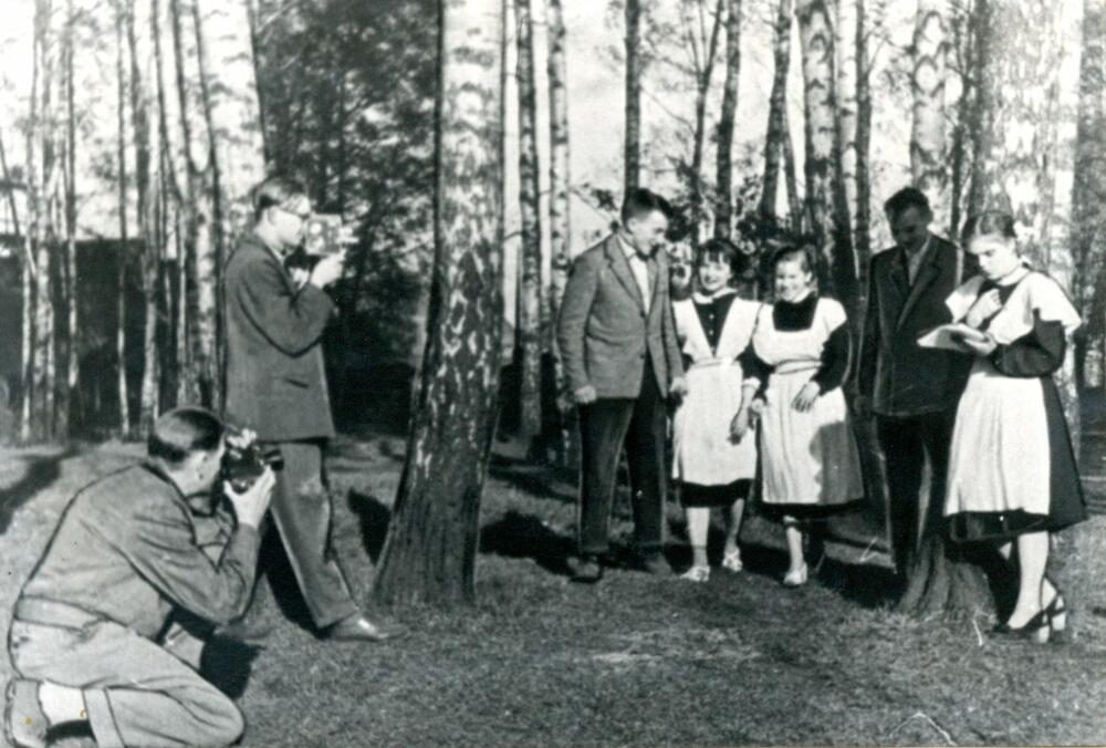 Rūpnīcas "VEF" teritorijā bērzu birzī "VEF" kinoamatieri, Tehniskās kontroles darbinieks, kinooperators Aleksandrs Šūmahers (no kreisās) un inženieris Valdis Rimeiks uzņem filmu "Īstais ceļš" ("Rūpnīcas jaunieši"?) par Rīgas 30. vidusskolas absolventiem, kas strādā rūpnīcā "VEF". Aleksandrs Šūmahers 1956. gadā nodibināja rūpnīcas "VEF" kinoamatieru studiju.
