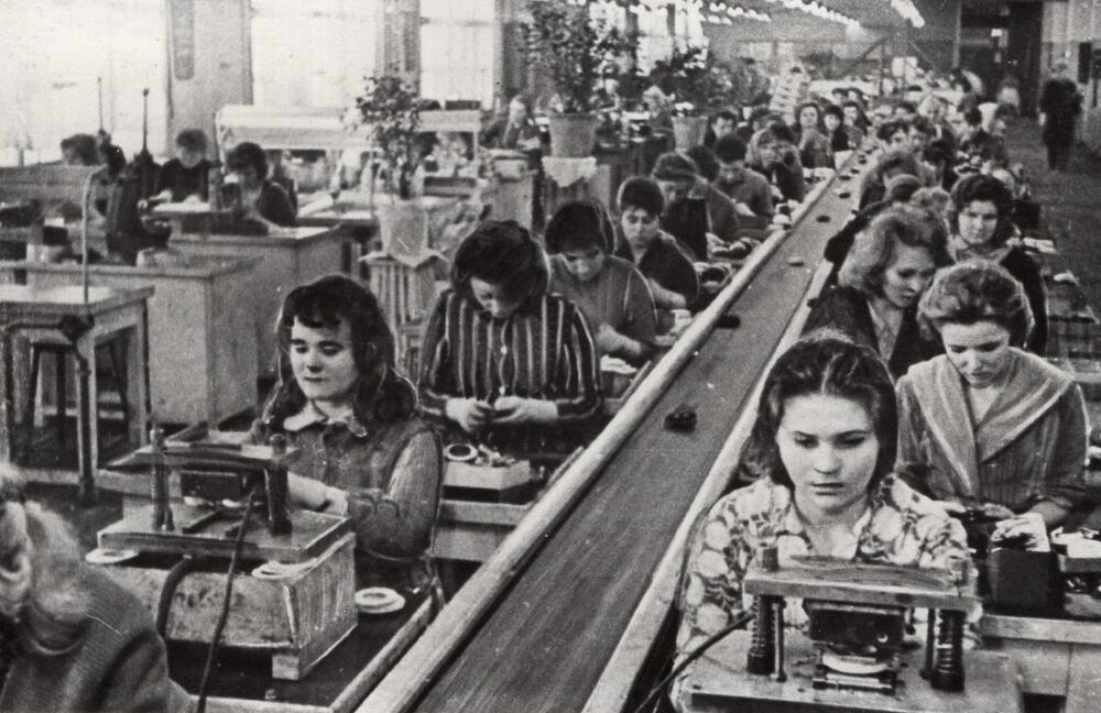 Valsts elektrotehniskās fabrikas (VEF) telefonu montāžas cehs. Darba process pie konveijera.