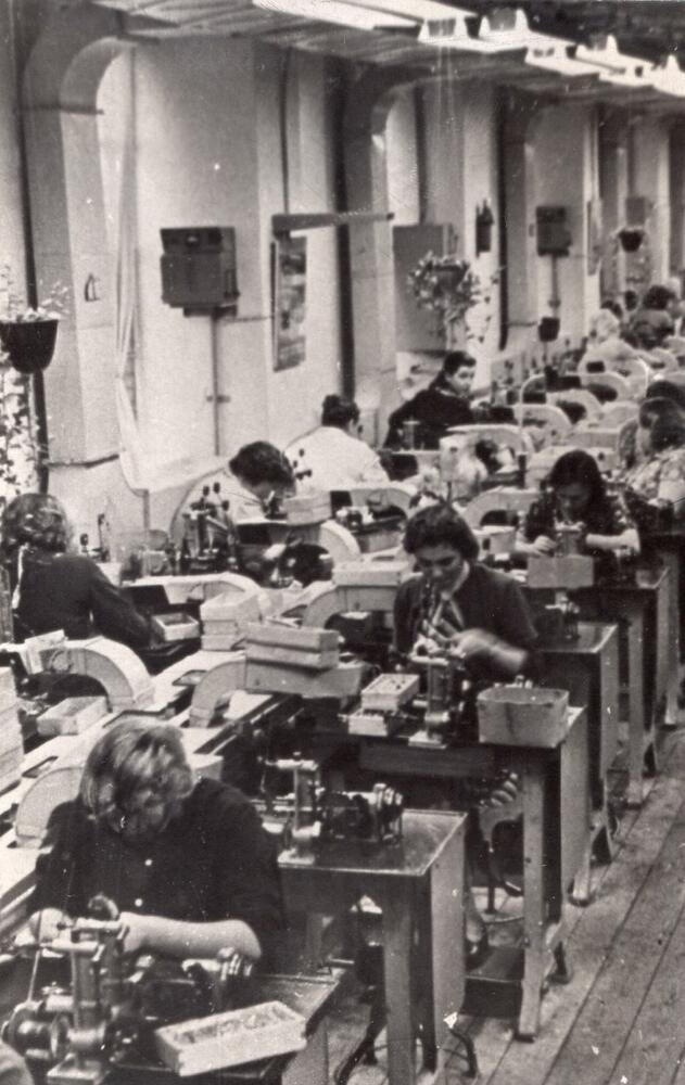 Valsts elektrotehniskās fabrikas (VEF) radio cehs. Ražošanas process radiolas "VEF-Radio" montāžas iecirknī.
