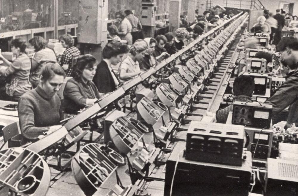 Valsts elektrotehniskās fabrikas (VEF) radio cehs. Ražošanas process pie tranzistoru radiouztvērēju "Spīdola" montāžas konveijera.
