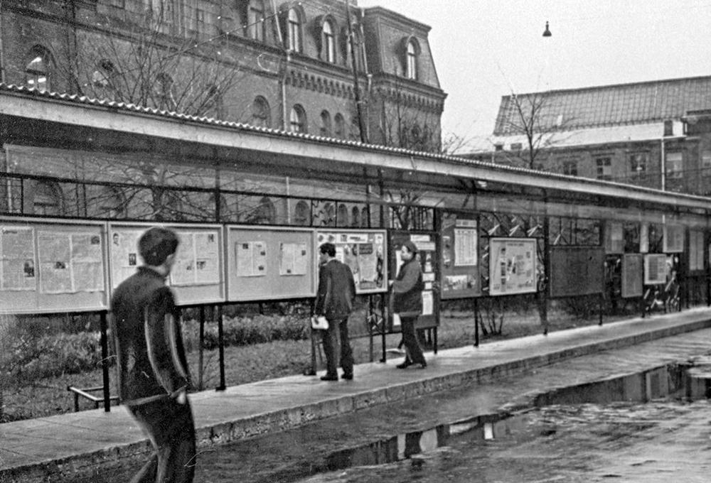 Jaunie ziņojumu stendi rūpnīcas “VEF” pagalmā.