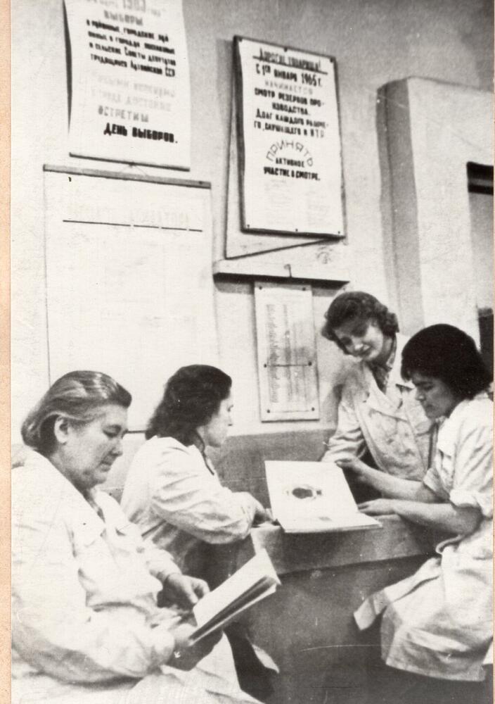 Valsts elektrotehniskās fabrikas (VEF) 7. ceha darbinieces politiskās izglītības kabinetā.