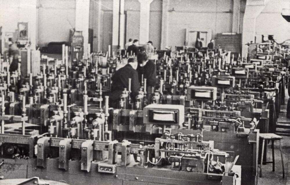 Valsts elektrotehniskās fabrikas (VEF) montāžas cehs. Ražošanas process releju atsperu izgatavošanas iecirknī.