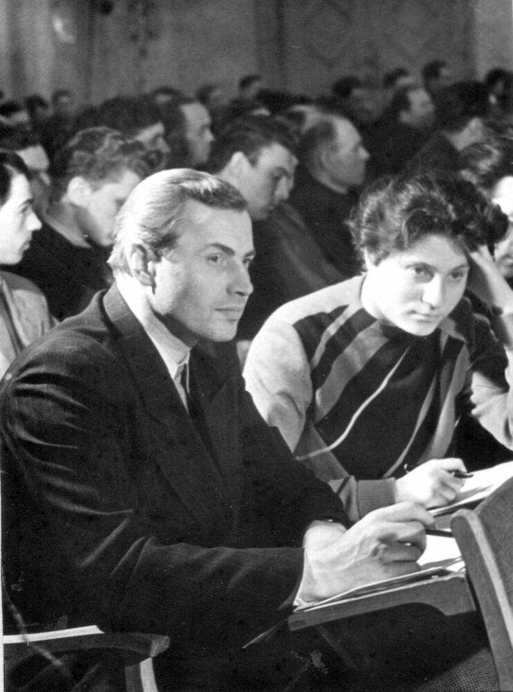 Rīgas rūpnīcas "Kompresors" virpotājs A. Kļava un Valsts elektrotehniskās fabrikas (VEF) centrālās laboratorijas ķīmiķe A. Rimeika (priekšplānā) Tehniskās jaunrades nama auditorijā.