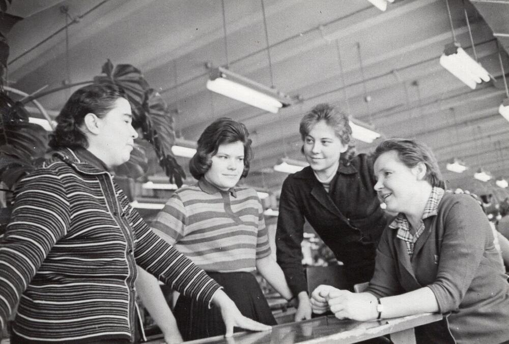 Valsts elektrotehniskās fabrikas (VEF) radio ceha montieres sarunu laikā. No kreisās: N. Švecova, M. Roštoka, T. Cvetkova un A. Ludborža.