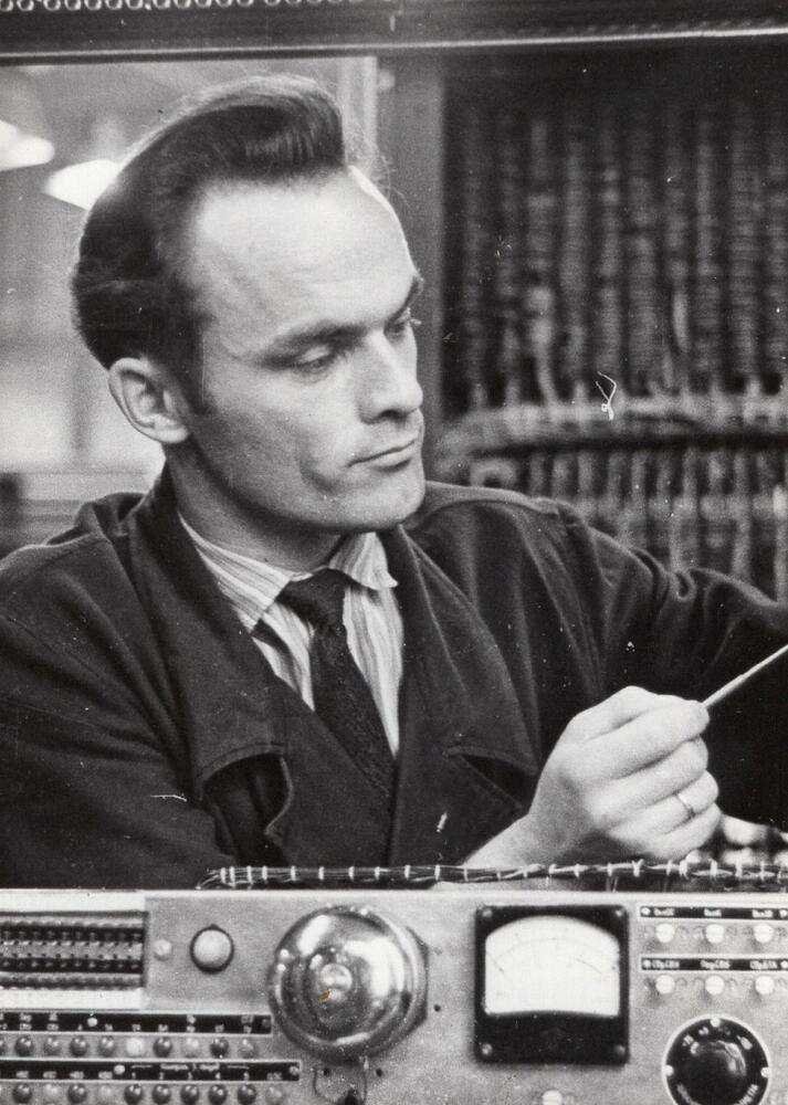 Valsts elektrotehniskā fabrika (VEF). Inženieris Aivars Kalnietis veic automātiskās telefona centrāles (ATC) regulēšanu.