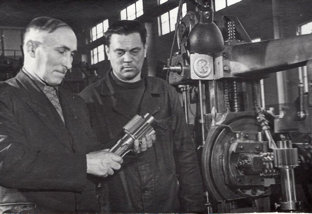 Valsts elektrotehniskā fabrika (VEF). Mašīnremonta ceha partijas darba organizators K. Zariņš (no kreisās) un frēzētājs E. Filipsons darba laikā.