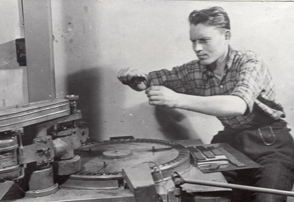Valsts elektrotehniskās fabrikas (VEF) slīpētājs I. Keits pie darba galda.