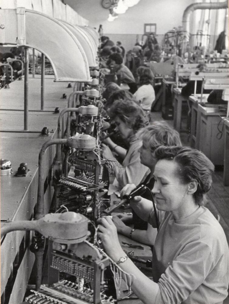 Valsts elektrotehniskās fabrikas (VEF) telefonijas cehs. Darba process pie pulsējošā konveijera.