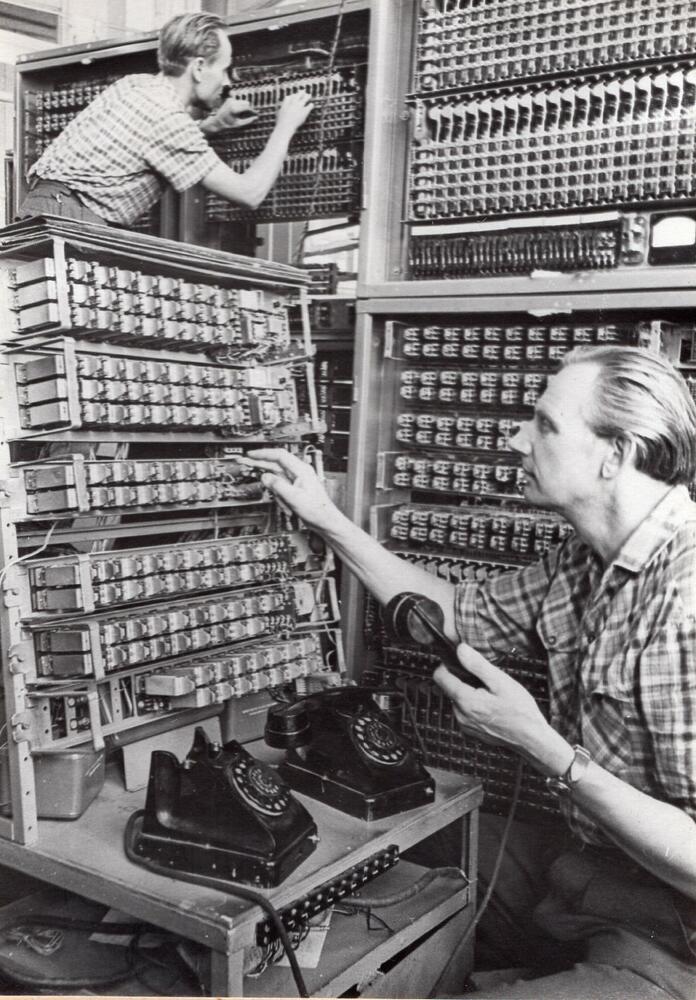Valsts elektrotehniskās fabrikas (VEF) telefonijas cehs. Koordinātu telefoncentrāļu regulētājs Oskars Pīlādzis (no labās) darba laikā.