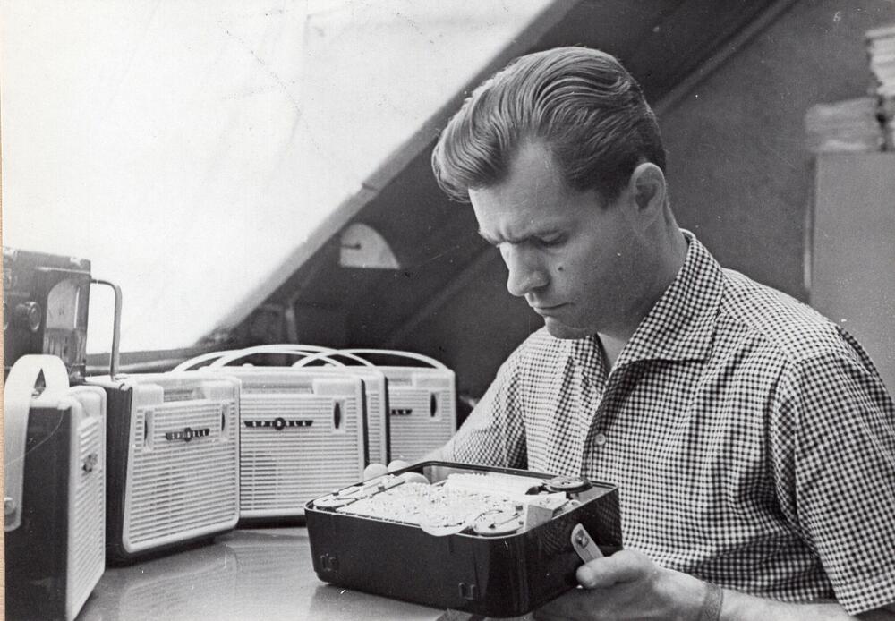 Valsts elektrotehniskā fabrika (VEF). Radio ceha aparātu iestatītājs Jānis Iesalnieks veic tranzistoru radiouztvērēju "Spīdola" regulēšanu.