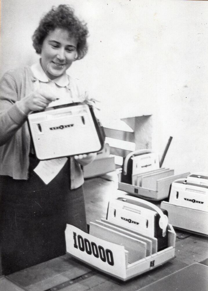 Valsts elektrotehniskā fabrika (VEF). Gatavās produkcijas noliktavas vadītāja Dzintra Liepiņa demonstrē 100000 tranzistoru radiouztvērēju "Spīdola".