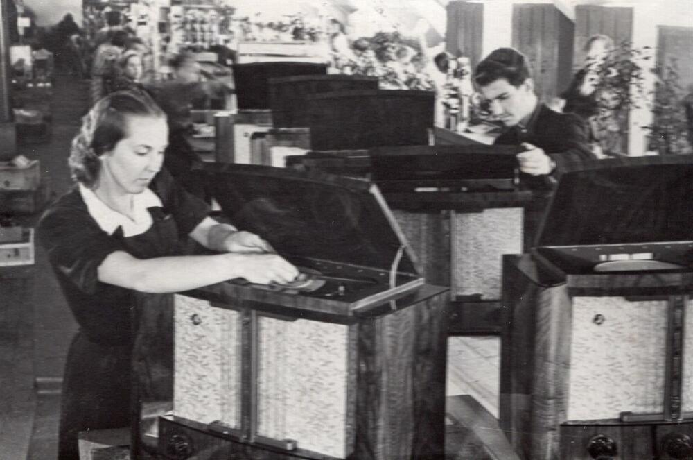 Valsts elektrotehniskā fabrika (VEF). Tehniskās kontroles nodaļas kontrolieri Lauma Bikse un Ansis Graudiņš veic radioaparātu "Mir" tehniskā stāvokļa kontroli.