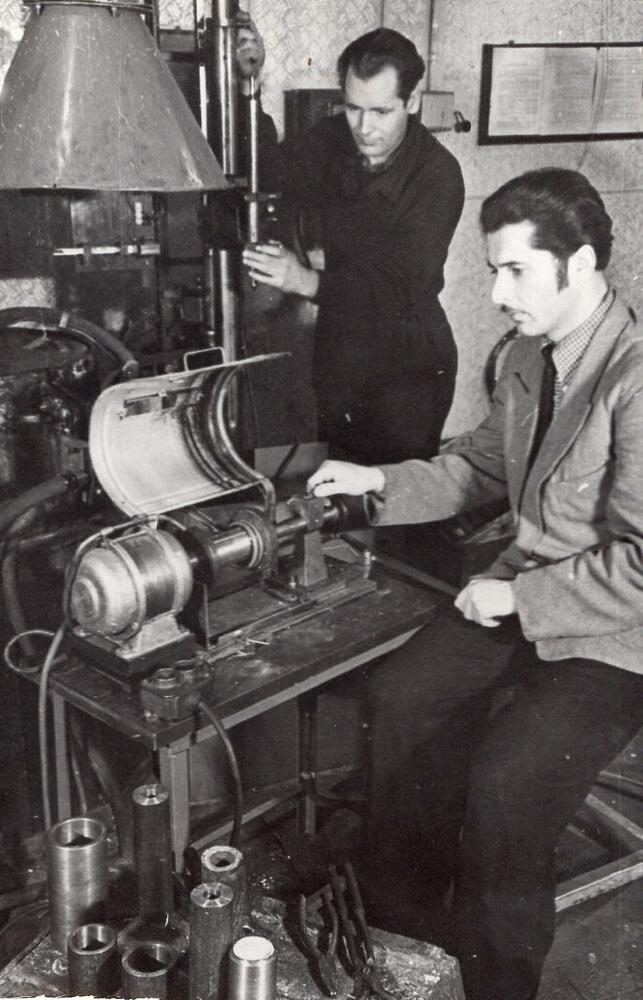 Valsts elektrotehniskā fabrika (VEF). Jaunās tehnoloģijas ceha inženieris A. Butmanis (no labās) un montieris P. Cīrulis pie darba galda.