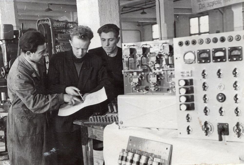 Valsts elektrotehniskās fabrikas (VEF) iekārtu testēšanas cehs. Montieratslēdznieks M. Goldins (no kreisās), speciālā konstruktoru biroja vecākais inženieris V. Plise un ceha vadītājs F. Seničevs veic elektroiekārtu vadības paneļu kvalitātes kontroli.