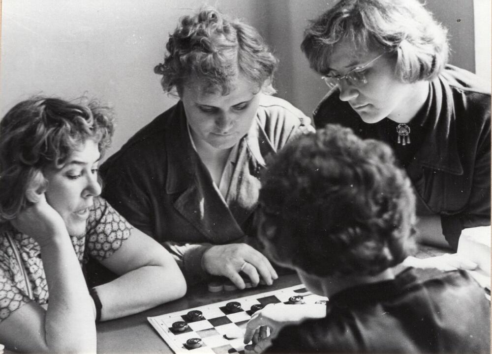 Valsts elektrotehniskā fabrika (VEF). Radio ceha darbinieces spēlē dambreti pusdienlaika pārtraukumā.