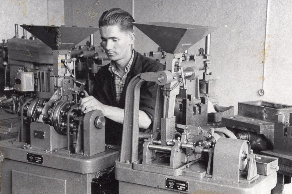 Valsts elektrotehniskā fabrika (VEF). Jauno tehnoloģiju ceha atslēdznieks Z. Kurmis pie darba galda.