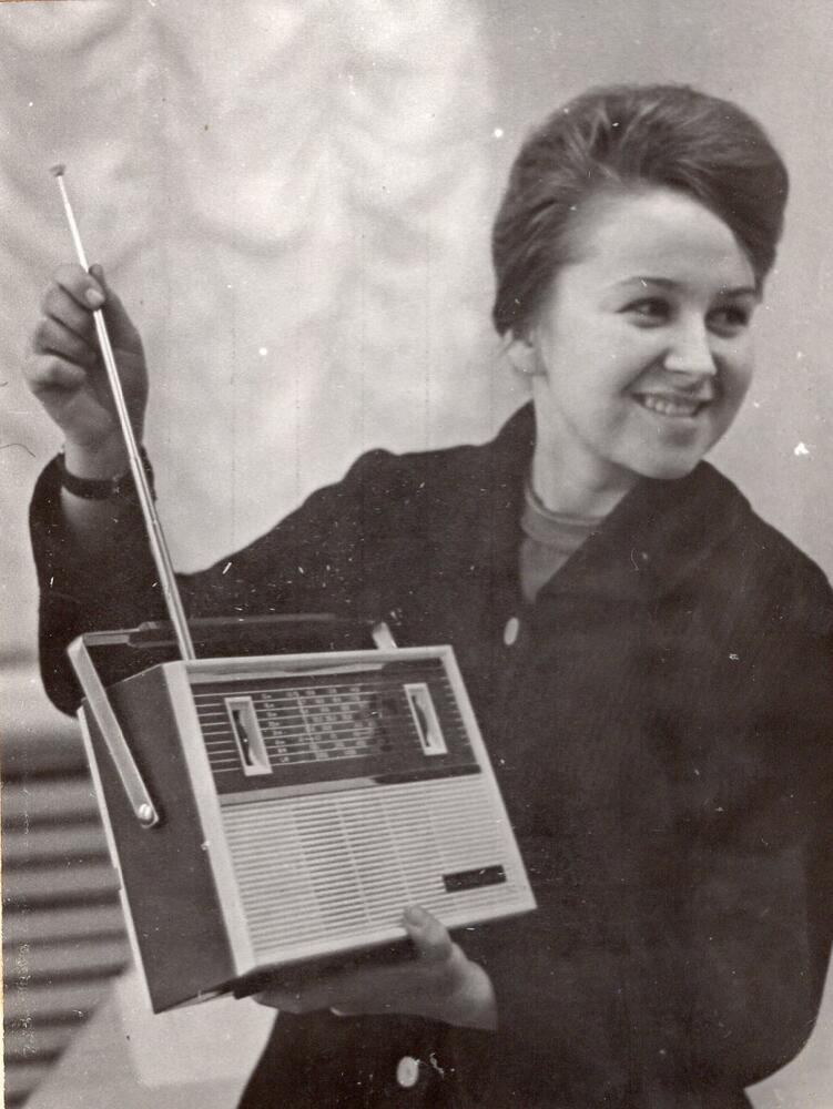 Valsts elektrotehniskās fabrikas (VEF) darbiniece Gaļina Gordejeva demonstrē tranzistoru radiouztvērēju "VEF - 10".