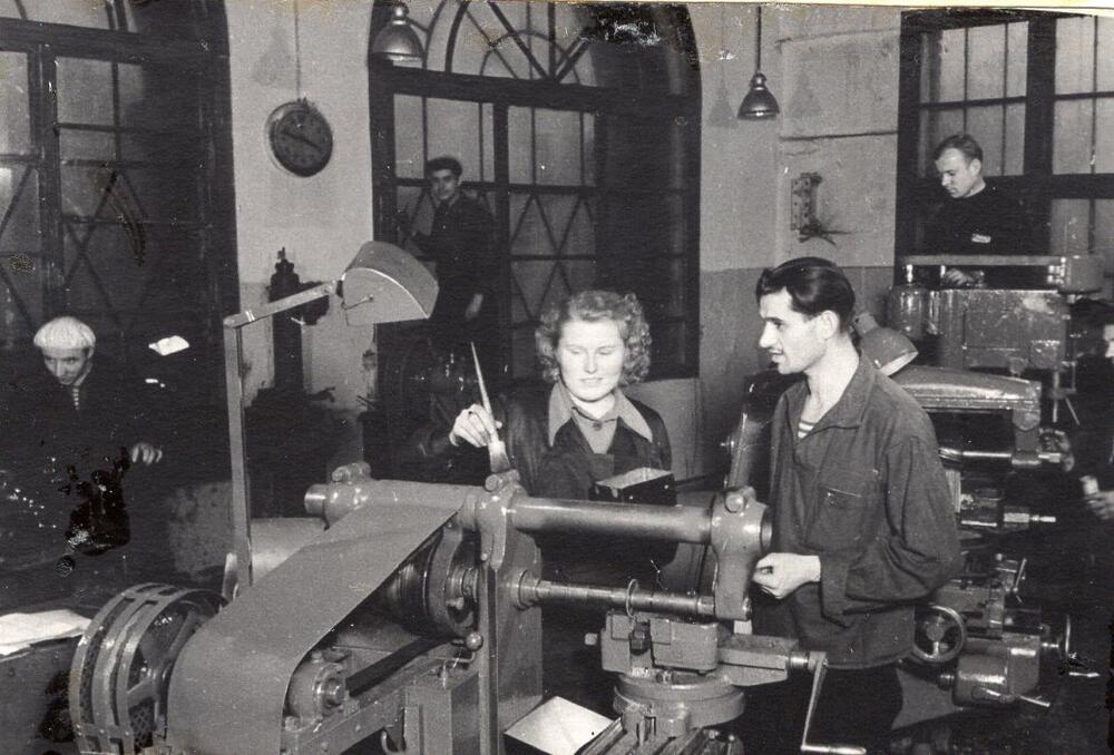 Valsts elektrotehniskā fabrika (VEF). Elektromehāniskā ceha kolektīvs krāso darba galdus.