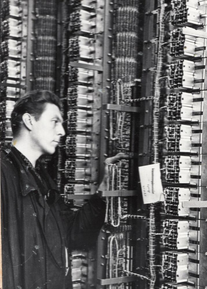 Valsts elektrotehniskās fabrikas (VEF) telefonijas cehs. Automātisko telefona centrāļu iestatītājs Bruno Vārpiņš darba laikā.
