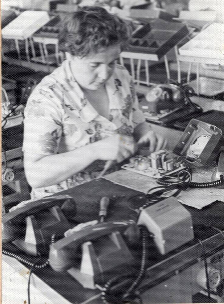 Valsts elektrotehniskā fabrika (VEF). Telefonu montāžas ceha montiere, ražošanas pirmrindniece Antoņina Britikova pie darba galda.