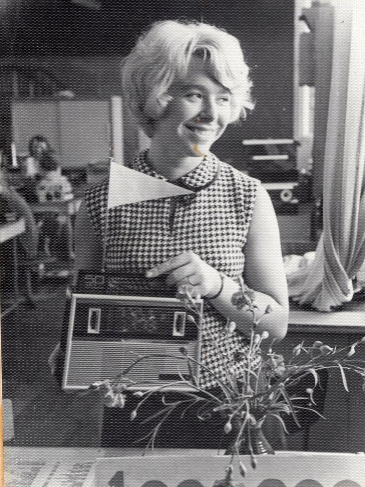 Valsts elektrotehniskā fabrika (VEF). Montiere Monika Pudāne demonstrē miljono tranzistoru radiouztvērēju "Spīdola".