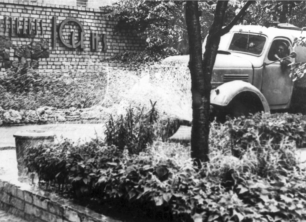 Zaļās zonas laistīšana ar specializētu automašīnu rūpnīcas “VEF” 10. ražošanas ceha teritorijā.
