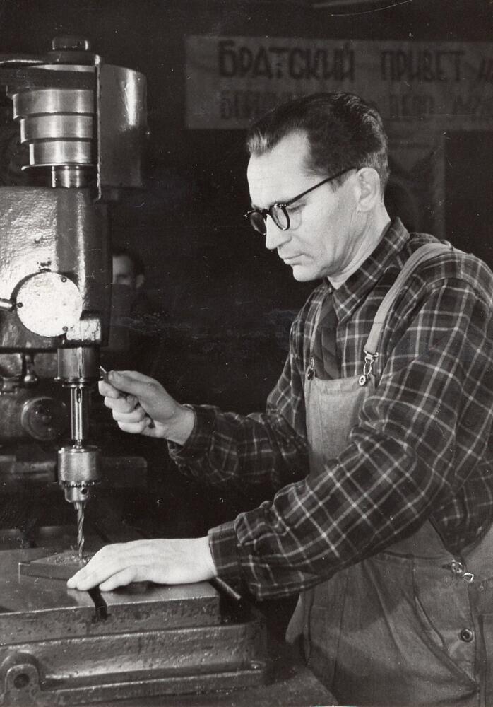 Valsts elektrotehniskā fabrika (VEF). Mehāniskā ceha brigadieris, atslēdznieks, ražošanas pirmrindnieks, Rīgas pilsētas Tautas deputātu Padomes deputāts Aleksandrs Grass pie darba galda.