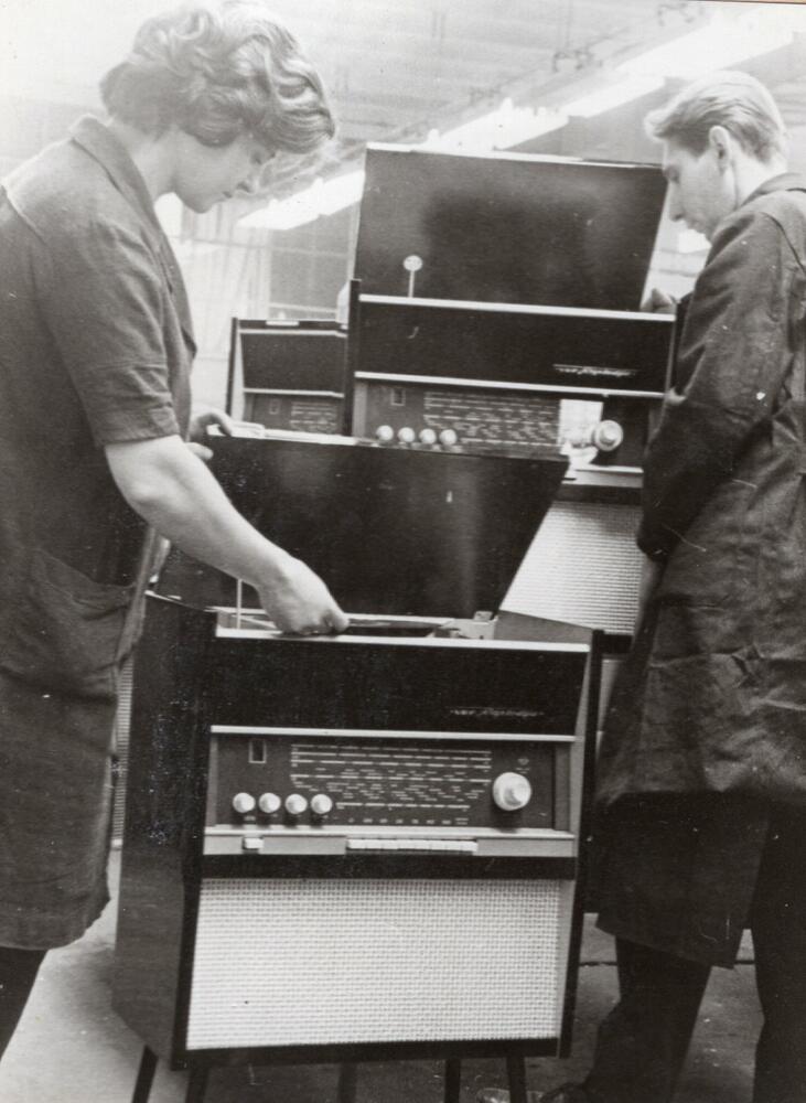 Valsts elektrotehniskās fabrikas (VEF) radio cehs. Montiere Irēna Budikova veic lampu radiolas "VEF Rapsodija" tehniskā stāvokļa kontroli.