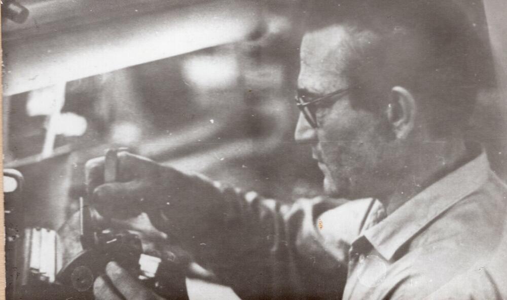 Valsts elektrotehniskās fabrikas (VEF) darbgaldu iestatītājs, uzņēmuma veterāns, komunistiskā darba trieciennieks P. Aleksandrovs darba laikā.