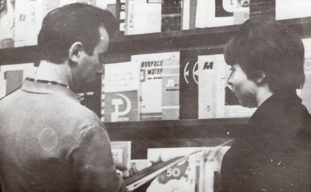 Valsts elektrotehniskā fabrika (VEF). Bibliotekāre Tatjana Kotova konsultē bibliotēkas apmeklētāju.